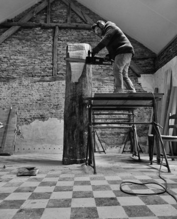 t all starts with a large tree stump that the artist slowly dismantles with a chainsaw.